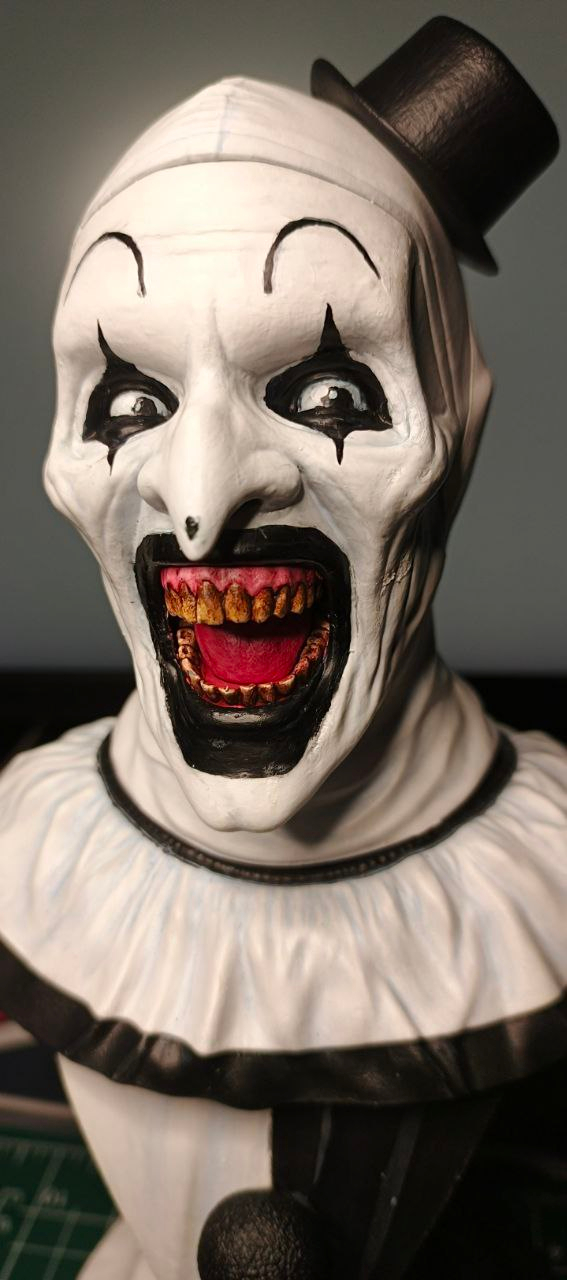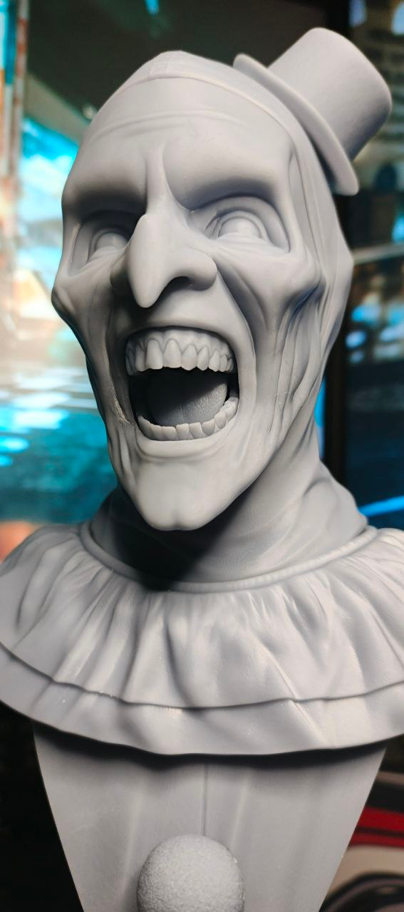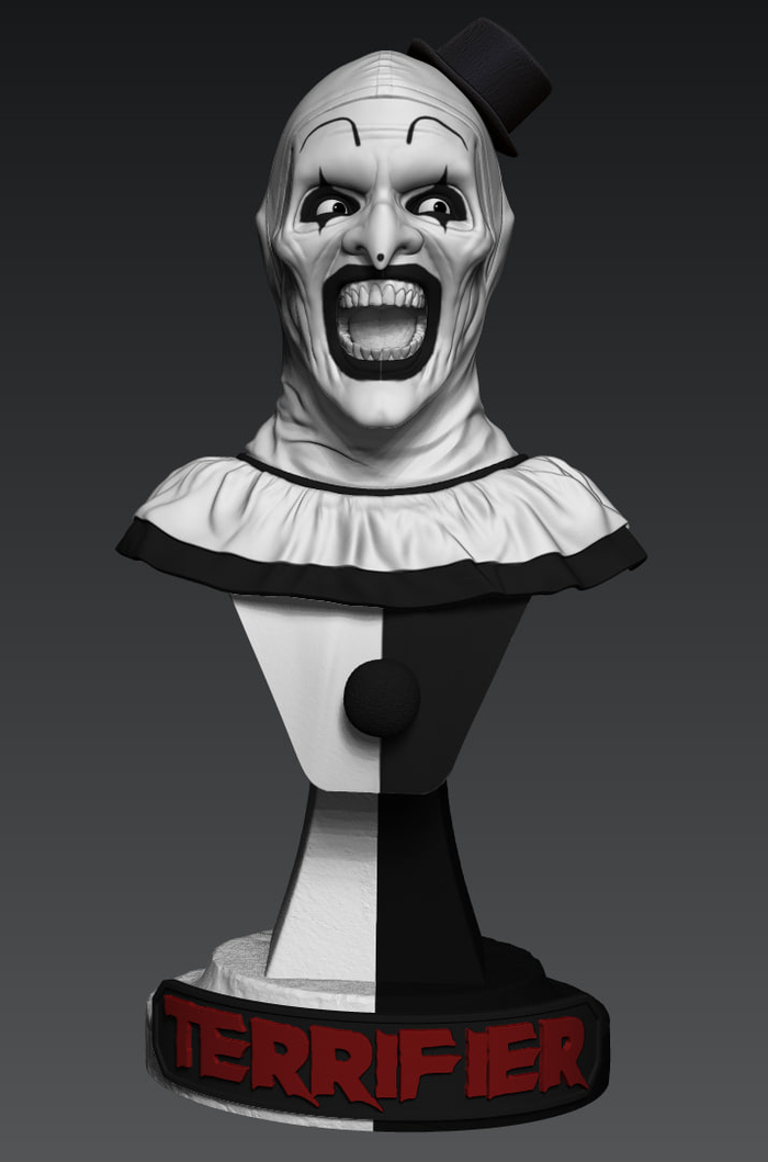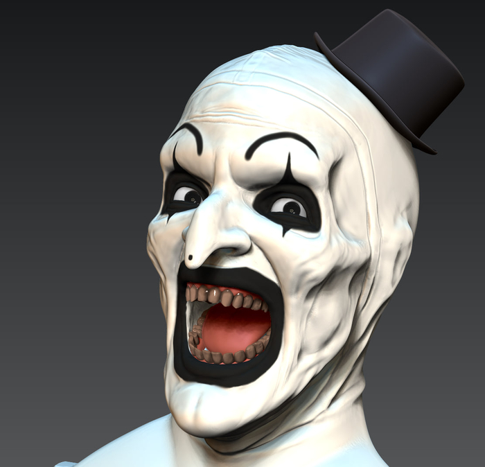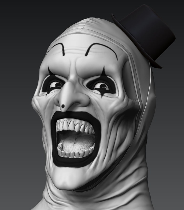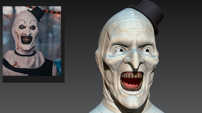 Всем зассе! Я тут практикую похожесть в 3д скульпте и собственно была моя личная задача собрать подарок для человека, который любит подобные штуки. Сразу же оговорюсь, я очень привередлив и придирчив к своим результатам. Вводные следующие Terrifier или Art The Clown, фильм не смотрел, персонажа встречал в гифках, видел некоторые модели на профильных сайтах, не придавал значения. В целом с лором не знаком, с сюжетом и главным героем и его повествованию тоже. Собрал референсов и побежал моделить. всего уложился в 3 итерации, 3d blockout, средние формы, детализация. Цели выдать сильные текстуры на поверхности не было, потому как раскрашиваться это все должно было только кистями, аэрограф пока не имею в распоряжении. Хотя я занимался росписью аэрографом много лет, не думал, что через круг мне понадобится его присутствие вновь, от чего много лет назад распродал весь инструмент...
