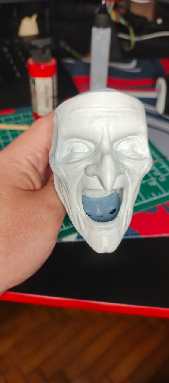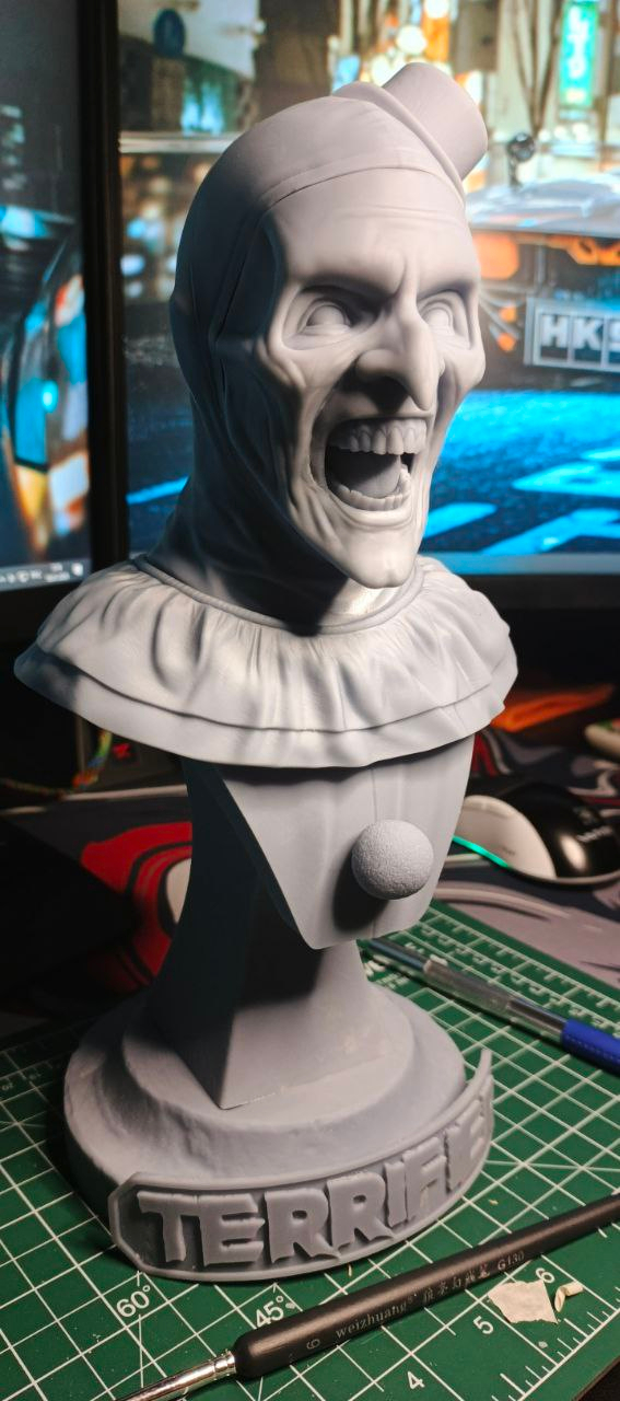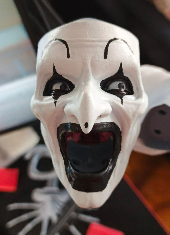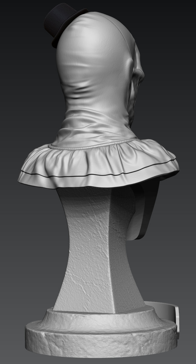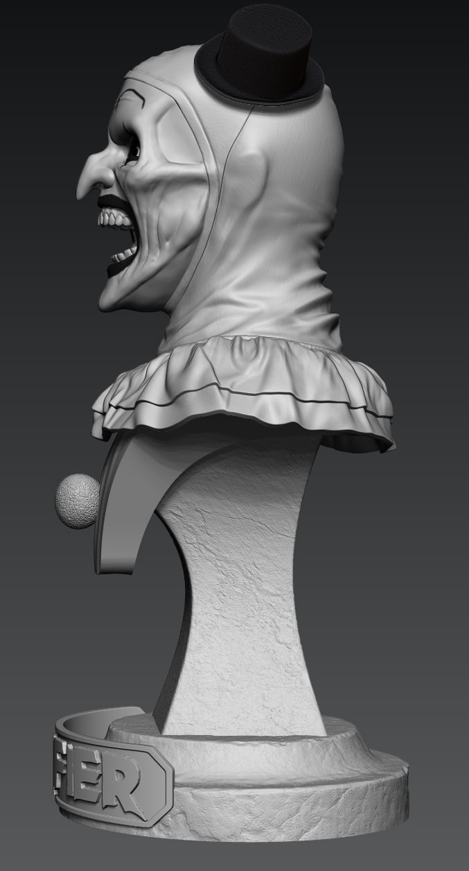 Всем зассе! Я тут практикую похожесть в 3д скульпте и собственно была моя личная задача собрать подарок для человека, который любит подобные штуки. Сразу же оговорюсь, я очень привередлив и придирчив к своим результатам. Вводные следующие Terrifier или Art The Clown, фильм не смотрел, персонажа встречал в гифках, видел некоторые модели на профильных сайтах, не придавал значения. В целом с лором не знаком, с сюжетом и главным героем и его повествованию тоже. Собрал референсов и побежал моделить. всего уложился в 3 итерации, 3d blockout, средние формы, детализация. Цели выдать сильные текстуры на поверхности не было, потому как раскрашиваться это все должно было только кистями, аэрограф пока не имею в распоряжении. Хотя я занимался росписью аэрографом много лет, не думал, что через круг мне понадобится его присутствие вновь, от чего много лет назад распродал весь инструмент...