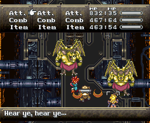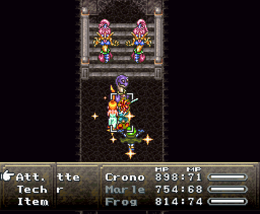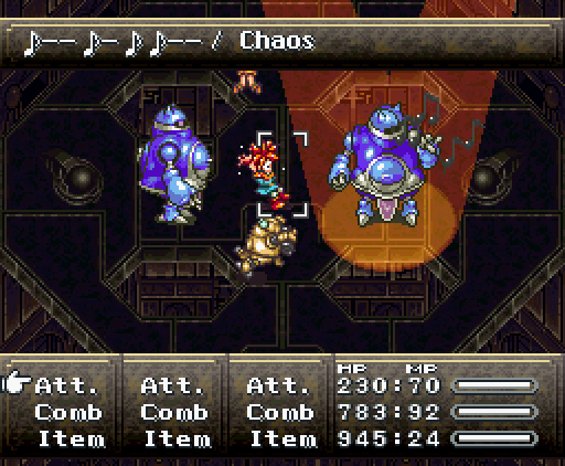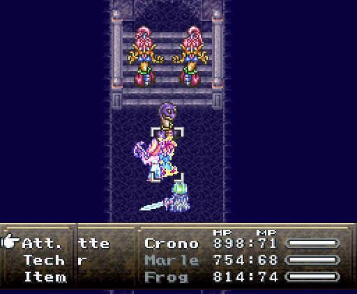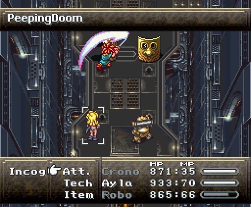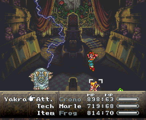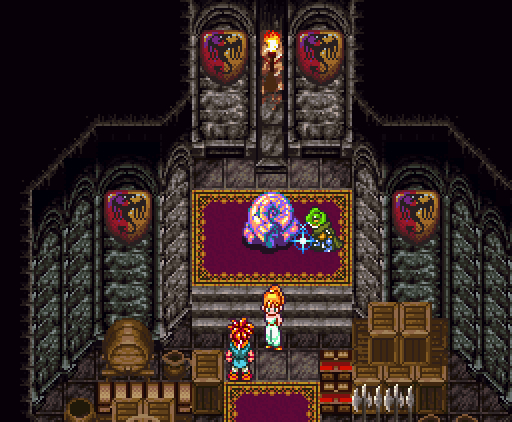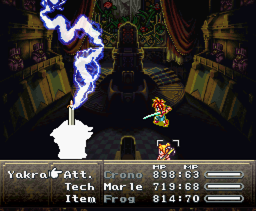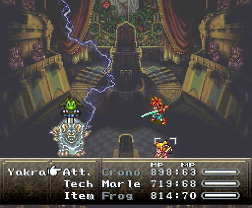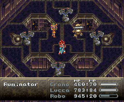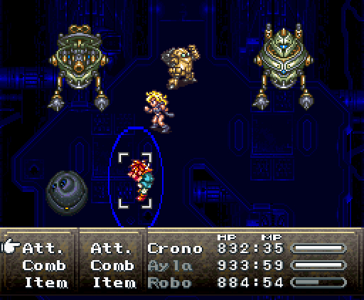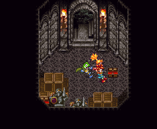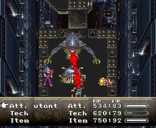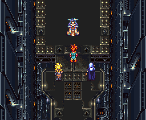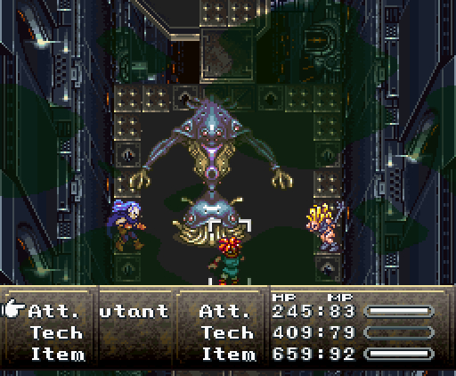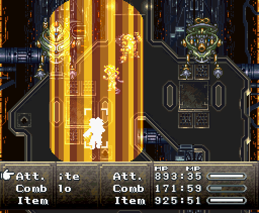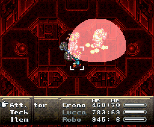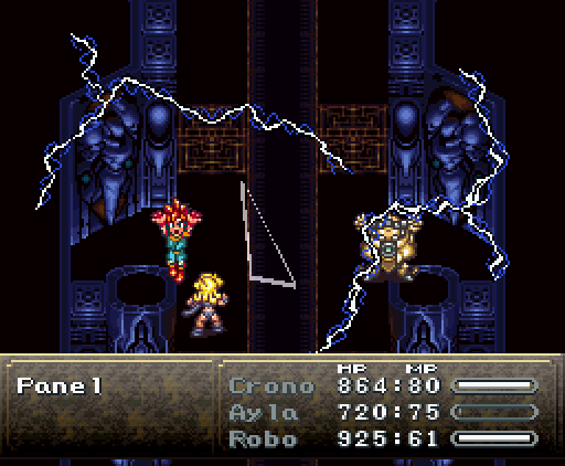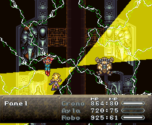 Когда герои проходят в помещение, их атакуют сами стены. Там установлены лазеры и ракеты, но что ещё хуже, стены, расположенные напротив, могут формировать облако тёмной плазмы. Тогда Хроно и Робо одновременно применяют *Thundaga* и *Электрическую атаку*, создавая сверхмощный разряд: *Супер-Электро*.