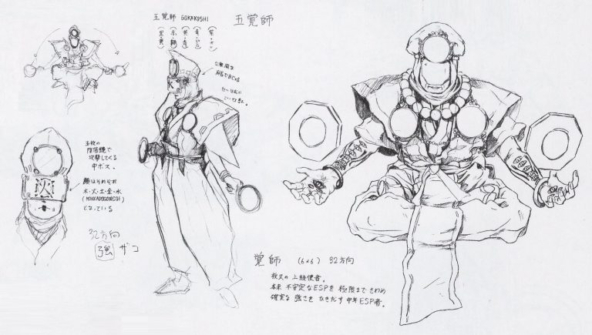 Концепт-арт вражеских персонажей Какуши (справа) и Гокакуши (слева). Описание гласит: "Какуши (Пробужденный Мастер). Высокопоставленный посланник Якши. Пользователь ESP средних лет, который отточил свою изначально нестабильную силу до абсолютного предела и обладает грозной мощью"