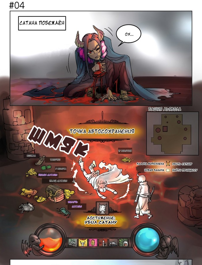 Естественно, как и положено героическому фэнтези, о победе Героя над Сатаной. С которого тут же дропается легендарный раритетный порножурнал.
