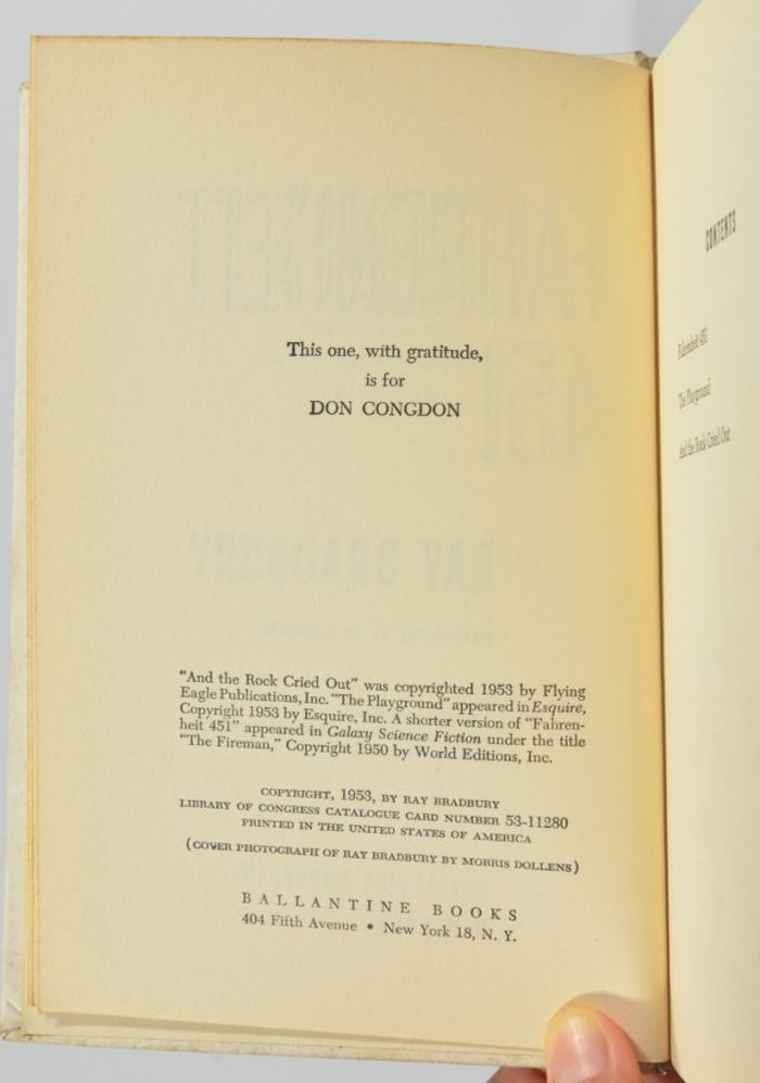 Данная книга является одной из 200 самых первых копий романа, отпечатанных в 1953 году. Все они были сделаны огнеупорными. Сохранившиеся копии по большей части находятся в частных коллекциях или в каких-либо организациях. Увидеть их можно очень редко.
