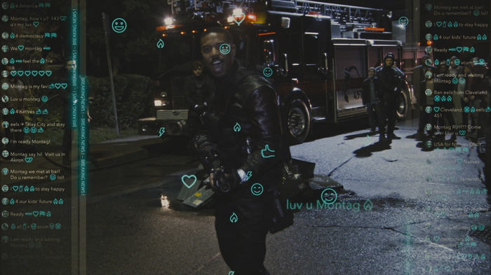 Вся история с трейлерами прошла мимо меня, про сам фильм узнал уже благодаря e-mail рассылке от этого самого стримингового сервиса. Честно говоря, раньше никогда не смотрел полнометражных фильмов от HBO, но после той же игры престолов, сложились положительные ожидания, так как качественно снимать этот канал умеет. Получилось очень скомкано. Первая мысль, которая возникла: была сделана попытка переснять классику, как несколько лет назад пересняли Шерлока Холмса, в реалиях современности и недалекого будущего. От книги остались только посыл и основные идеи о скудности телевидения и других электронных средств передачи информации, тоталитарной системе в обществе, наказаниях за самые скромные проявления инакомыслия. На самом деле, если учесть тот факт, что изначально режиссер Рамин Бахрани планировал просто адаптацию на современный лад, то ситуация крайне плачевна: сменились только декорации и, несмотря, на полный перекрой самой книги, качественно новых идей или способов подачи сюжета наблюдать не приходится. В итоге, мы видим некий полуфабрикат, когда операторская работа, костюмы, цвета и качество съемки в целом удались, но способы работы тоталитарной машины остались на уровне мышления самого Бредбери. И ситуация с цифровыми технологиями уже далеко не так очевидна: электронная книга стала нормой, журналистика перебирается в интернет и прогресс, как таковой, несмотря на колоссальную значимость бумажных книг,не заключается только в них. Начиная просмотр, я ожидал именно пересмотра идей автора оригинальной истории сквозь призму сегодняшних реалий. Тот же Шерлок претерпел множество отклонений, но получился качественно новым, соответствующий духу времени. Здесь же кроме прямых эфиров в духе инстаграма и эмозди повсюду я так и не увидел.