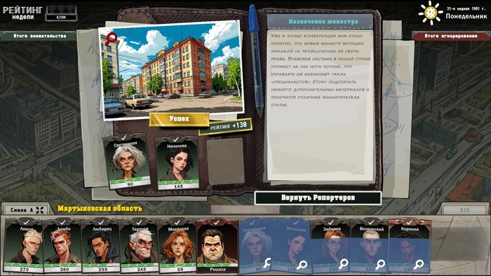 В свободное от работы время пытаюсь заниматься разработкой небольших компьютерных игр. На определенном этапе у меня появилась идея создать небольшую игру о вымышленной стране, очень сильно напоминающей республики постсоветского пространства. В игре мы играем за главного редактора захолустной местечковой газеты и пытаемся превратить ее во флагман печатных СМИ. Игра является скорее стратегией (тайкуном), но предоставляет игроку возможность добиваться своих целей разными путями и отыгрывать разные стили управления и поведенческие модели. История полностью выдуманная, но те, кто хорошо помнят то время или много знают о нем встретят множество знакомых ситуаций и отсылок.