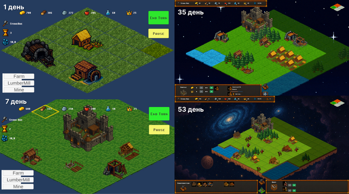 Отличительной особенностью было только то, что вид в изометрии (похоже на Populous) и здания можно было самому выбирать, где строить (почему-то захотелось). Арт я генерировал в виде заглушек ИИ, таким образом разрабатывать было интереснее, нежели как я обычно вставлял заглушки в виде квадратиков цветных.