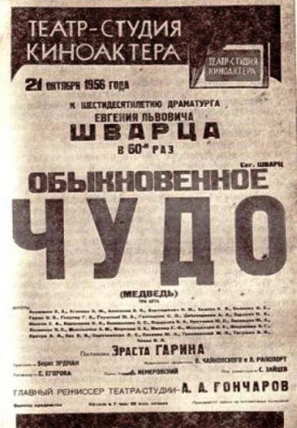 21 Октября 1956 года совпали два события. Евгению Шварцу исполнялось 60 лет и на сцене театра шел шестидесятый показ спектакля «Обыкновенное чудо». О тех событиях Эраст Гарин пишет: «Осенью Е. Л. Шварц отмечал свое шестидесятилетие. У нас в Театре киноактера в день его рождения шел шестидесятый спектакль. Мы выпустили специальную афишу: «К шестидесятилетию драматурга Евгения Львовича Шварца. В 60-й раз “Обыкновенное чудо”».