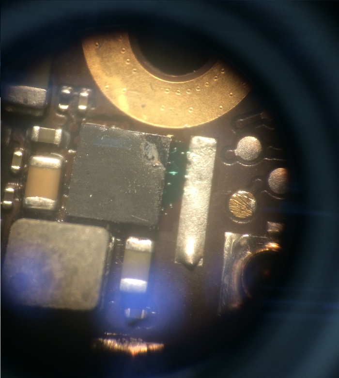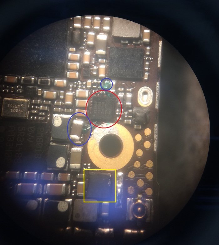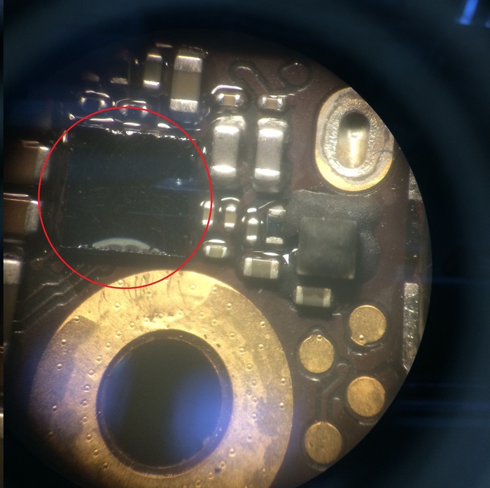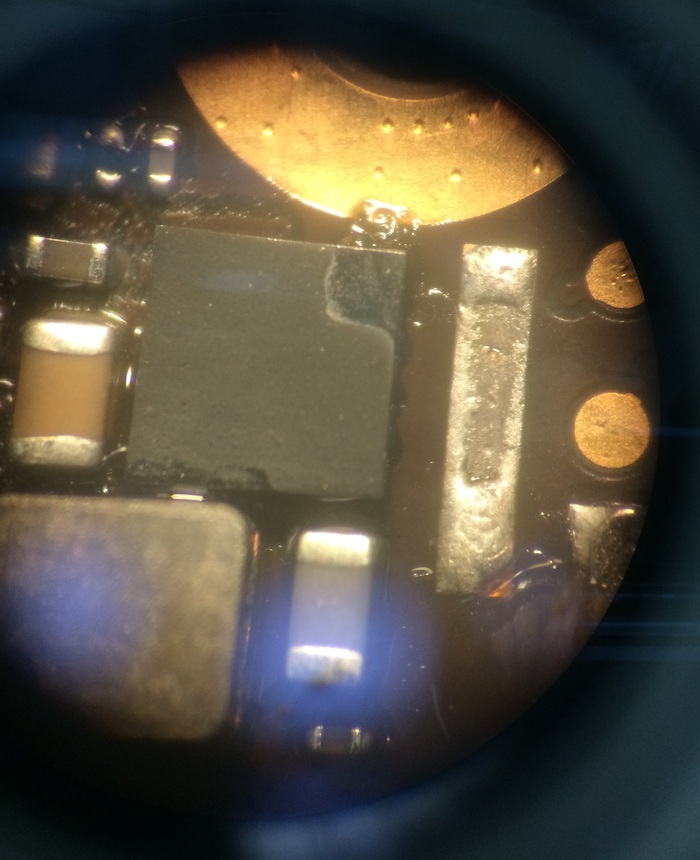 А внутри оригинальная плата, вот прям настоящая, правда вся в каких то наклейках с китайскими иероглифами, и... Перепаян модем. Либо восстанавливали, либо меняли. Для совсем не понимающих о чем речь - модем в iPhone нужен для всех видов взаимодействия с сотовой сетью, звонки/смс/3G/4G, и именно эта часть у этого телефона была не исправна, восстановлена на скорую руку, не залита смолой и умрет при первом же попадании в обстановку с повышенной влажностью.