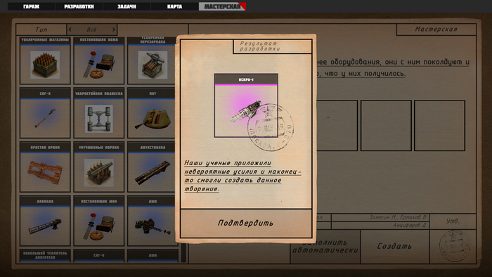 Добавлена мастерская. Творите чудеса в новом пространстве! Теперь бесполезный хлам можно отправить на переработку инженерам, и они постараются создать что-то новое. Возможно, это будет ИСКРА-1, а может, и просто масло для трансмиссий. Но рискнуть стоит — возможно, вам повезет!