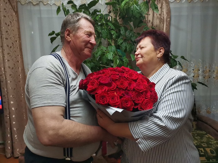 а здесь моей тете на юбилей ее супруг подарил 51 розу и они мило обнимаются