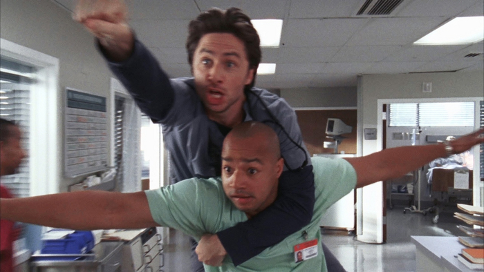 Там бывали моменты со смешными падениями Джей Ди, но многое строилась на отсылках к другим произведениям, абсурде, текстовых шутках и остроумных идеях. Закадровый смех бы только помешал, и «Клиника» доказала это в серии «Моя жизнь в четыре камеры». Там в больницу Sacred Heart попадает сценарист классического ситкома «Веселая компания», и Джей Ди представляет всё как сериал с закадровым смехом.