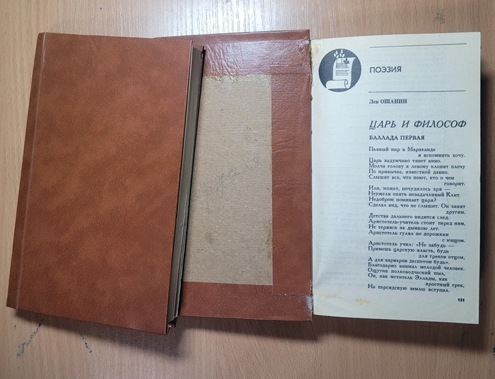 Основа — сшивание. Это была ювелирная (или сапожная) работа. Сложенные стопкой тетрадки будущего блока нужно было аккуратно проколоть шилом по полю, чтобы не задеть текст. Потом — сшить суровыми нитками. Сначала прокалывал шилом, но и после этого игла впивалась в плотную бумагу с усилием. Склеивал самодельным столярным клеем. Обложки склеивал обычным канцелярским, но он хрупкий, и для проклейки блоуов не годился. Готовый блок клал под пресс и оставлял на ночь или больше, пока не высохнет.