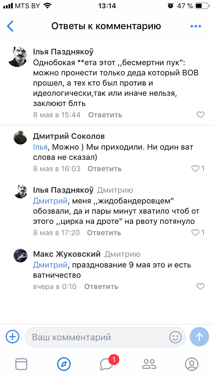 Я безумно горжусь, восхищаюсь и уважаю подвигом наших предков. Безмерно благодарен. И 9 мая для меня день скорби и памяти. Но скорбеть и помнить можно дома, например, устроив своим детям просмотр контента по тем далёким событиям, рассказывая им о тех страшных временах и о тех, кто, не жалея себя, приближал великую Победу. Помочь ветеранам и детям войны. Выйти на субботник, в конце концов, чтобы сделать чуть чище город за который, в том числе, умирали на той войне.