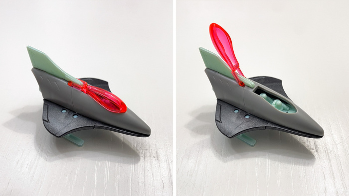 Колпак кабины пилотов откидывается, а ещё корабль можно водрузить на подставку, нацелив его нос в небо.