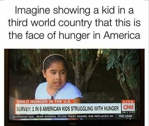 15 sashastatic Голод 8 лет назад "Представьте, что ребенку из страны третьего мира показывают, каким является олицетворение голода в Америке" "1 из 6 американских детей борется с голодом" Голод США 9GAG Картинка с текстом Страны третьего мира