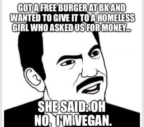 Contentious Веган 8 лет назад Получила бесплатный бургер в БК и хотела отдать его бездомной девушке, просившей у нас денегОна сказала: Ой, ненужно, Я — веган Веганы Голод 9GAG