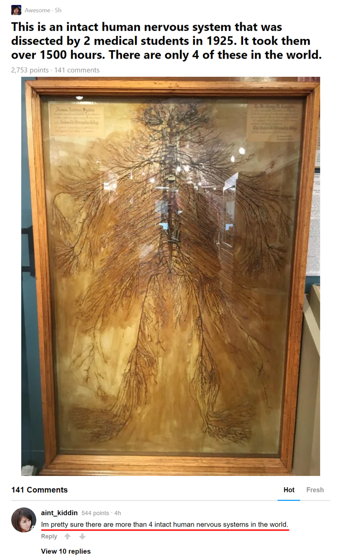 Это неповрежденная нервная система человека, которая была препарирована двумя студентами-медиками в 1925 году. Это заняло у них более 1500 часов. В мире их всего 4.