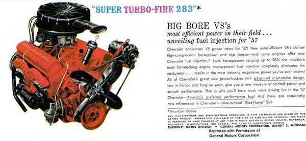 Топовая версия этого двигателя выдавала 283 л.с. — по одной лошадиной силе на кубический дюйм, что в то время считалось весьма значительным достижением, поскольку подобным результатом мог похвастаться лишь Chrysler, выпустивший в 1956 году модель 300-В с двигателем Hemi (355 л.с. на 354 куб. дюймов). Для Bel Air предлагались два инжекторных двигателя — 283 л.с. и дефорсированный мощностью 250 л.с. В стандартном исполнении на автомобиль устанавливались карбюраторные версии того же 283-кубового двигателя: два «корветовских» 270 л.с. и 245 л.с. со сдвоенными 4-камерными карбюраторами, 220 л.с. (4-камерный карбюратор), 185 л.с. (2-камерный карбюратор). Кроме них можно было заказать еще старые двигатели: 265-кубовую «восьмерку» (162 л.с.) и 235-кубовую «шестерку» (140 л.с.). Всего получалось восемь вариантов двигателей. К трем видам трансмиссии добавилась еще одна новая автоматическая — Turboglide, — обеспечивающая плавность хода с высокой скоростью переключения передач. Turboglide частично состояла из алюминиевых деталей, а потому была легче старого «автомата» Powerglide почти на 40 кг.
