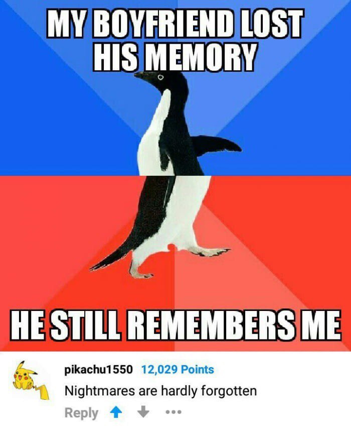 9 KranOg Потеря памяти 8 лет назад Мой парень потерял памятьОн все еще помнит меня*коммент* кошмары сложнее забыть Показать полностью 1 Мемы Пингвины 9GAG