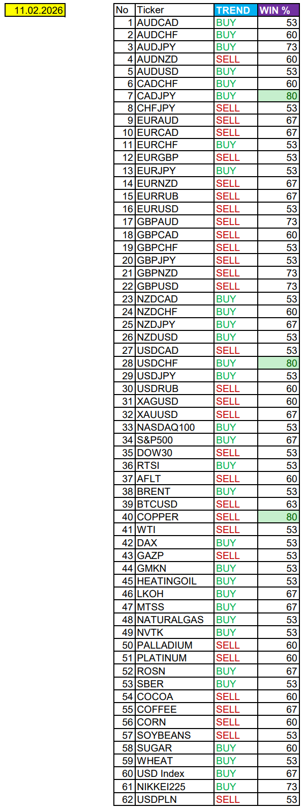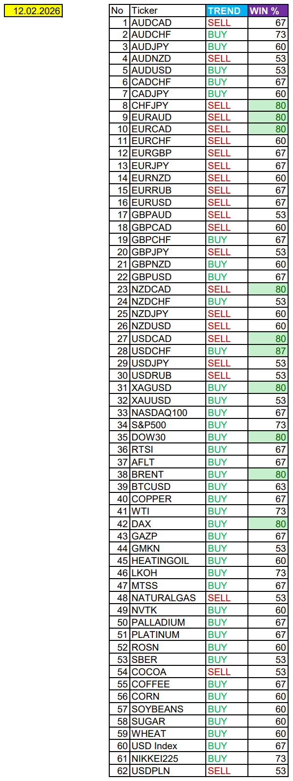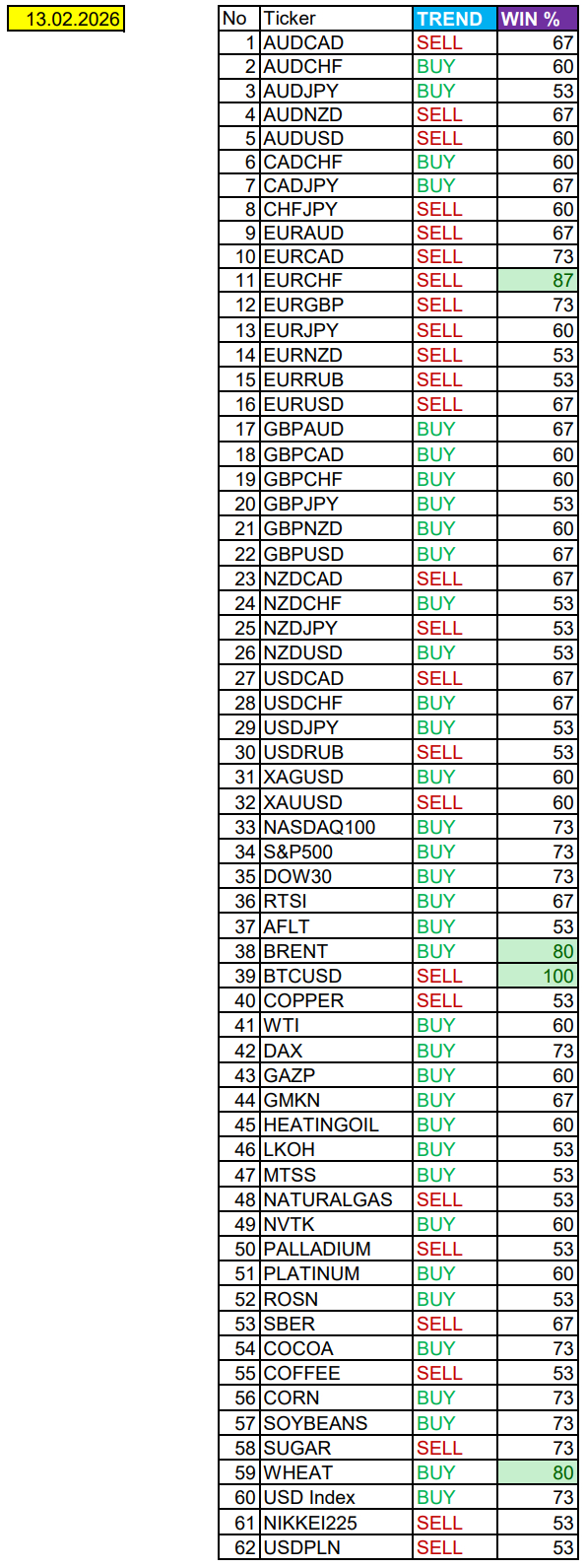 Очередные сезонные тенденции на пятницу 13 февраля 2026 по основным мажорам финансовых рынков.
