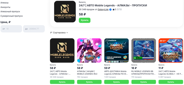 Заходите на сайт ggsel и в поиске пишете «Mobile Legends».