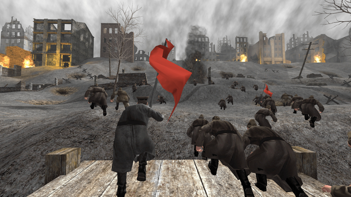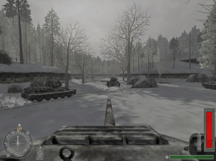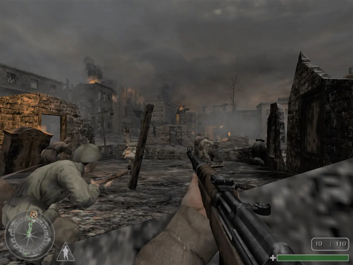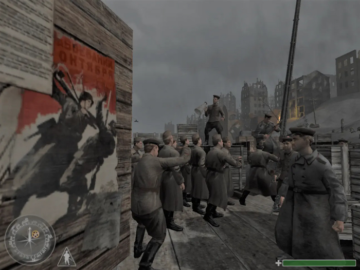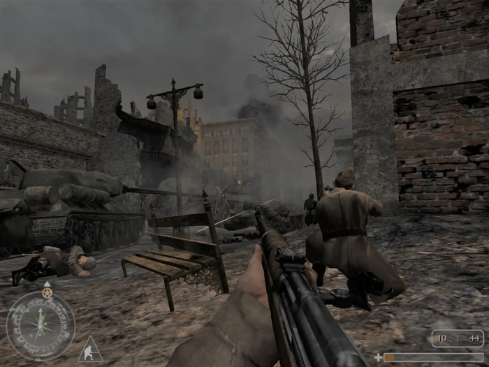 Советская же кампания начинается со внутривенной инъекции клюквенного сиропа: со штурма Сталинграда с одной обоймой патронов к «мосинке» (и приказом добыть оружие в бою) и заградотрядов, стоящих в ста метрах от немецких позиций, расстреливающих отступающих бойцов. И если второе вполне себе можно списать на простую клюкву, первое имеет вполне понятную цель – сфокусировать внимание игрока не на стрельбе по противнику, а на режиссуре самого штурма, который ничем не уступает тому самому штурму «Омаха бич»: вокруг рвутся гранаты, свистят снаряды, вопят самолеты, орут комиссары, гибнут сослуживцы, в грязь падают флаги и все это под пафосные трубы и струны Майкла Джакино. В конце этого эпизода, впрочем, все возвращается на круги своя, с бОльшим упором на открытые пространства – штурм главной площади и ж/д вокзала с большой группой сослуживцев, а затем штурм и мучительная оборона того самого дома Павлова, вместе с самим Яковом Федотовичем. Заканчивается кампания танковой миссией в Польше, которая, нуу… танковая миссия в «Колде». Nuff said.