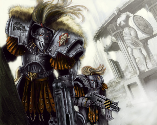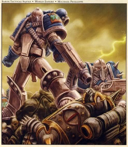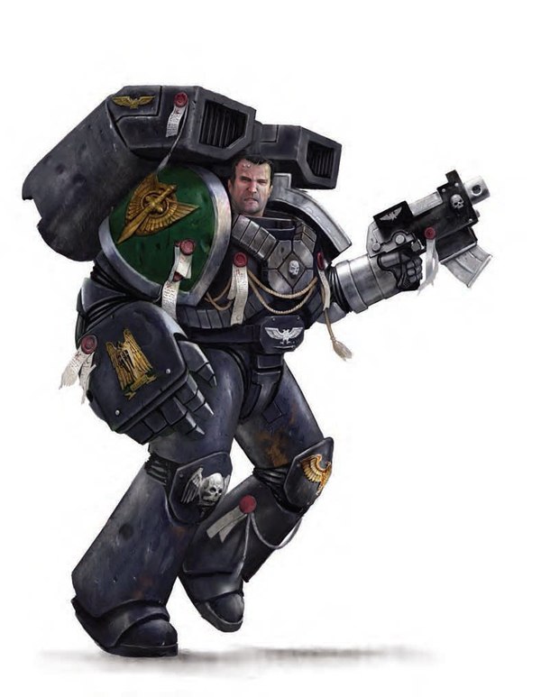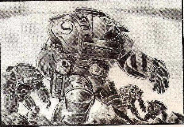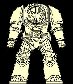 В то время когда набирала обороты Ересь Гора, ремесленники Космического Десанта работали с несколькими экспериментальными образцами терминаторской брони, один из которых мы и видим сейчас. Даже беглый осмотр указывает на то, что упор был сделан на фронтальную защиту. Большие наплечники и голова "утопленная" в плечах, обеспечивали максимальную защиту от вражеского огня. Компоновка силового доспеха была такова, что все кабели, каждый из которых содержит несколько охлаждающих контуров и фибросвязок, были вынесены наружу. И хотя доспех выглядит довольно непривычно, опытный глаз увидит прототипы элементов будущих модификаций Тактической брони дредноута. Можно узнать цилиндрическую окантовку броневых пластин, высокое крепление плечевых пластин и тяжелые ботинки. Овал на левом наплечнике - это место для геральдики Ордена. Дизайн грудного пластрона горячо обсуждается Имперскими историками - одни утверждают, что это стилизованные крылья Имперского орла, в то время как другие говорят, что сходство случайно и это ребра жесткости для усиления грудной пластины. Очень немногие из этих моделей сохранились до сих пор, а те которые еще действуют, чрезвычайно ценятся и используются исключительно для различных церемоний. Почему от них отказались? Самый убедительный довод - они были слишком громоздки и из-за этого неповоротливы, броня второго типа, разработанная после нее, имела больший коэффициент полезного действия.