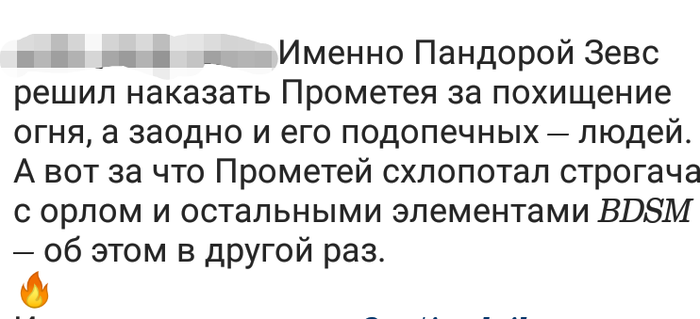 Прометей обучил всю эту биомассу разным полезным фишкам и профессиям, рецептиков клёвых накидал, чтобы пипл с голоду не окачурился. Но народец был непуганным и ложил болт на поклонение богам, что сильно кошмарило Зевса, любившего, чтобы все ему напоминали о его божественной офигенности и звездатости.