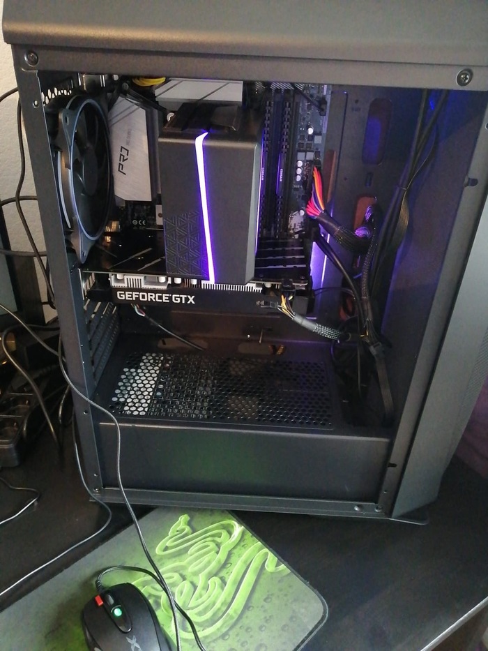 Комплектуха, вроде вся новая i3-10100/B460M Pro4/16Gb DDR4 и GFA GTX 1660, которую ему отдал брат... собираем, корпус вызывает сомнения Aero One Eclipse RGB, на новый не похож