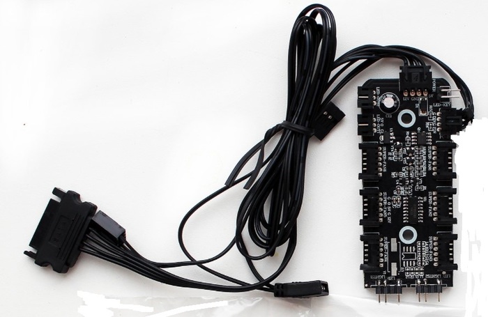 Вы спросите, что это за хня, а это плата управления RGB вентиляторами, очень нестандартная, питается от SATA(5-12вольт) разъема блока питания, и коннектится к материнке в разъемы: