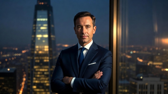 «Используй лицо мужчины с загруженного фото без изменений. Средний план, мужчина в идеально сидящем темно-синем костюме-тройке, белая рубашка, галстук в тон. Стоит у панорамного окна небоскреба, руки скрещены на груди, выражение уверенное и спокойное, направлен в камеру. За стеклом — вечерний мегаполис с огнями. Освещение Рембрандта, теплый контровой свет от окна, размытый фон. Фотореалистичный кадр, качество 8K, вертикальный формат. Negative prompt: blurry face, extra fingers, distorted features, cartoon style, oversaturated colors.»