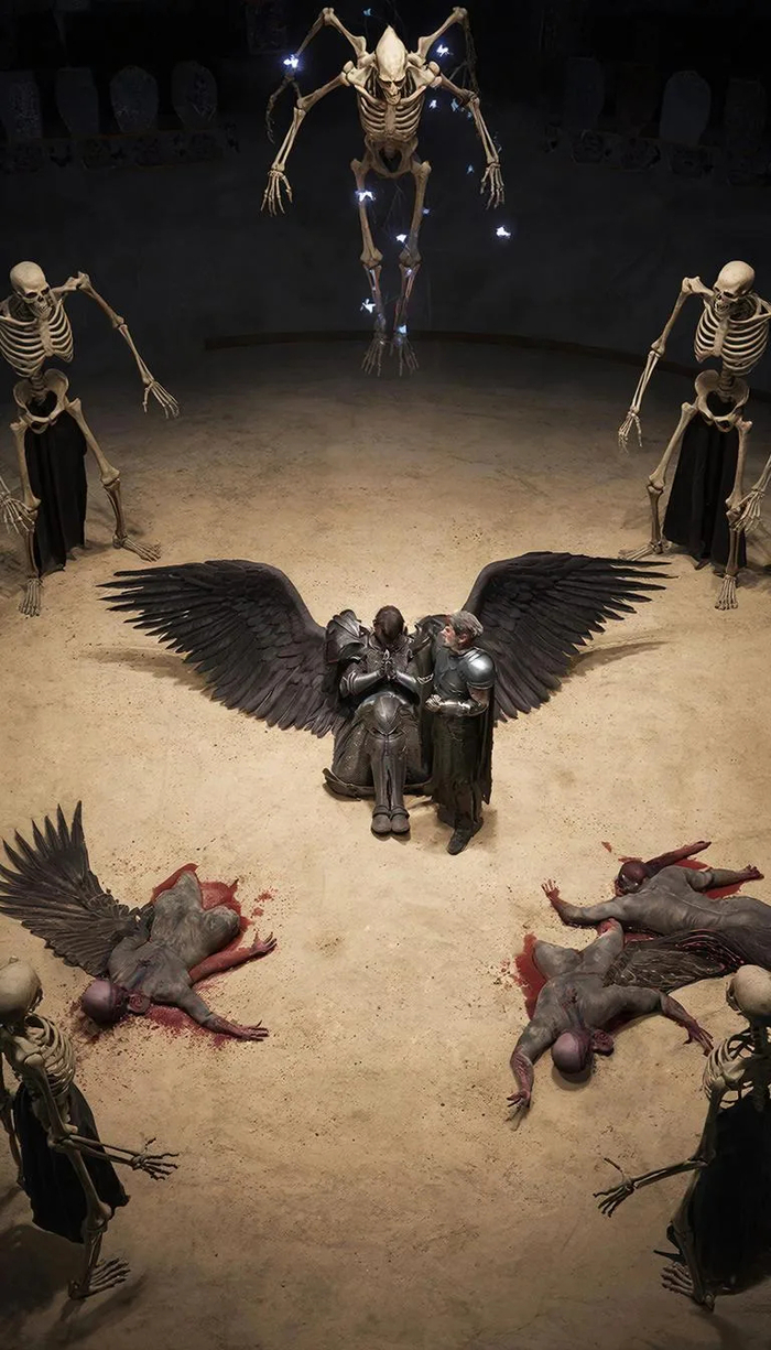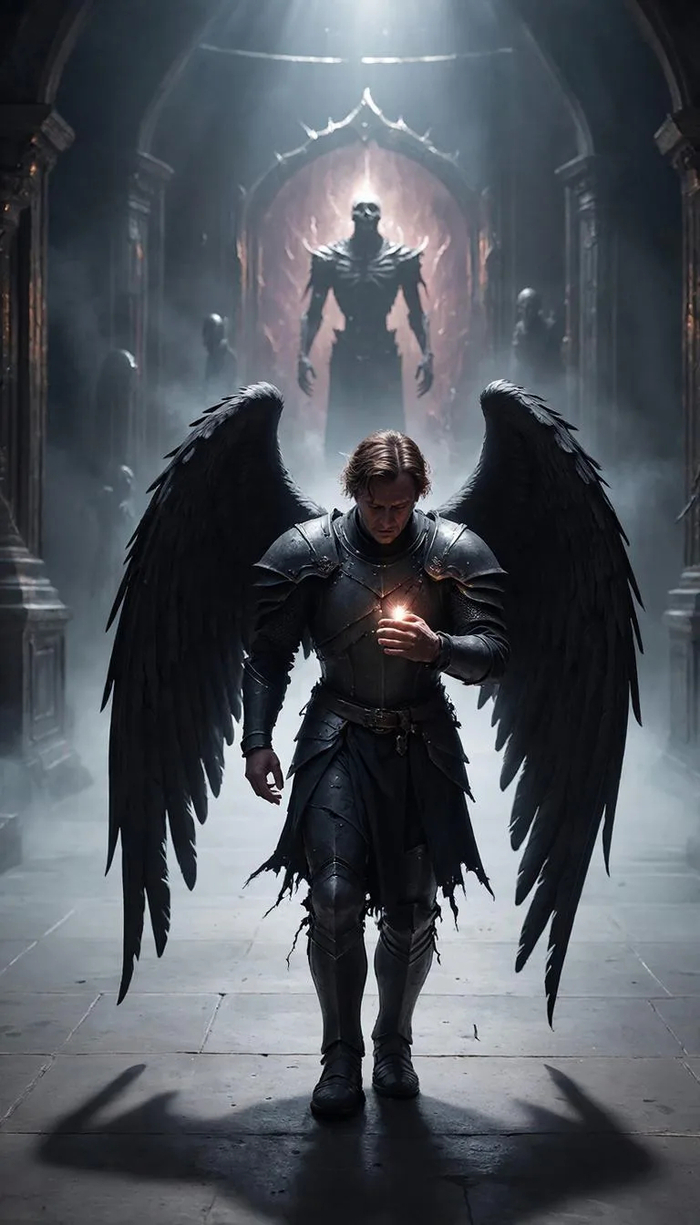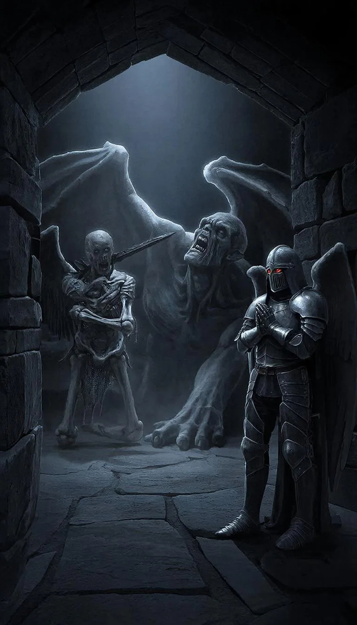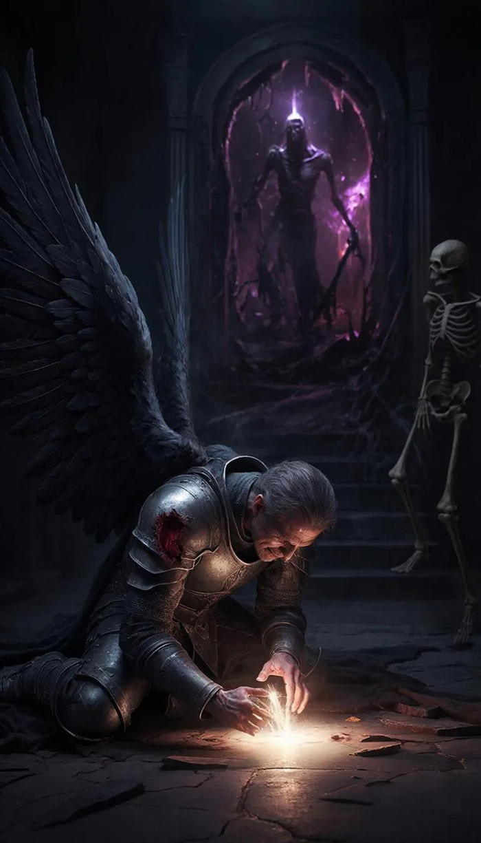 «Используй лицо мужчины с загруженного фото без изменений. Средний план, он в полном комплекте стальных рыцарских доспехов со следами ударов и потертостями. Под латами — кольчуга, на плечах — плащ с гербом, потрепанный и испачканный. Шлем снят и зажат под мышкой. На лице — грязь, мелкие ссадины, усталое, но решительное выражение прямо в камеру. Позади — дымящееся поле битвы, воткнутые в землю знамена, пасмурное небо. Рассеянный холодный свет, детализация металла и текстуры кожи, десатурированная палитра, пленочная зернистость, 8K, 9:16. Negative prompt: blurry face, shiny clean armor, cartoon, modern elements, extra limbs, smiling.»
