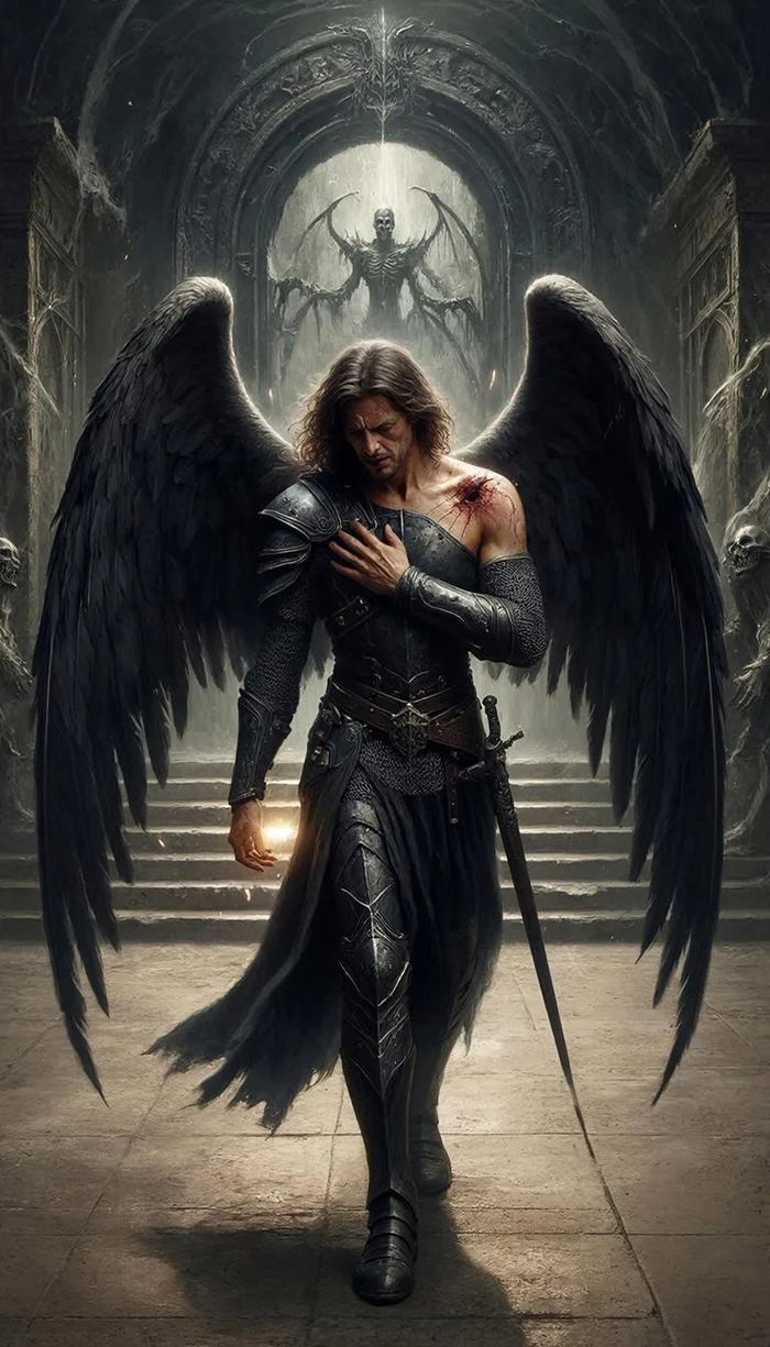 «Сохрани лицо и внешность мужчины с референса. Крупный план, он стоит перед большим разбитым зеркалом в темном пустом помещении. В каждом осколке отражается его лицо с разным выражением: в одном — спокойствие, в другом — гнев, в третьем — усмешка, в четвертом — задумчивость. Центральный осколок — самый крупный, в нем отражение смотрит прямо на зрителя. Сам герой стоит спиной к камере, видны затылок и линия плеч в темной рубашке. Точечный боковой свет, блики на острых краях стекла, темная холодная палитра с теплыми отражениями, кинематографичный кадр, 8K, 9:16. Negative prompt: blurry reflections, cartoon, identical expressions in all shards, bright room, extra people, distorted glass, daylight.»