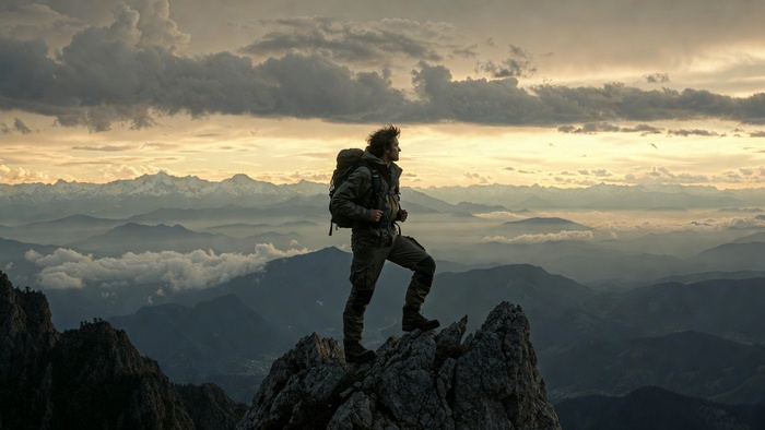 «Используй лицо мужчины с загруженного фото без изменений. Полный план, он в треккинговой куртке, штанах-карго и ботинках стоит на скалистом выступе горной вершины. Рюкзак за спиной, одна нога выставлена вперед на камень, руки на лямках рюкзака. Ветер треплет волосы, взор направлен вдаль. Позади — бескрайняя панорама горных хребтов, облака ниже уровня героя, снежные пики на горизонте. Рассветный свет, золотисто-холодный контраст, контровой свет, объемные облака, кинематографичная глубина, 8K, 9:16. Negative prompt: blurry face, distorted proportions, flat background, cartoon, extra limbs, indoor setting.»