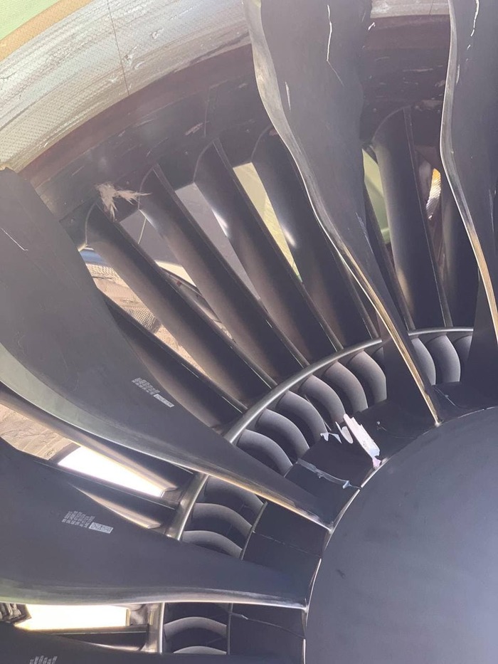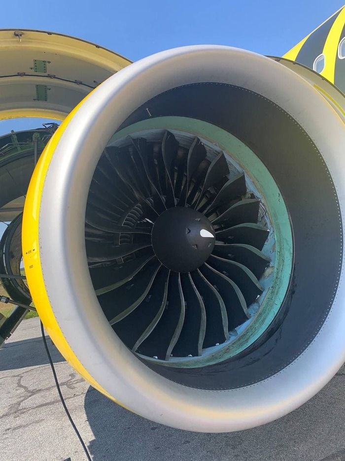 Фотографии повреждений двигателя Pratt & Witney PW1127G, установленного на самолёте Airbus A320Neo (б/н N922NK) а/к Spirit Airlines, который вчера был вынужден прекратить взлёт из-за попадания птицы в двигатель на разбеге.