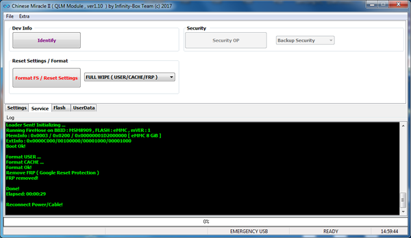 Цепляем программатор к компьютеру. Запускаем программу InfinityBox CM2QLM. Далее идём на вкладку Service. Из выпадающего списка выбираем RESET FRP, либо FULL WIPE(USER/CACHE/FRP), кому как больше нравится. )))