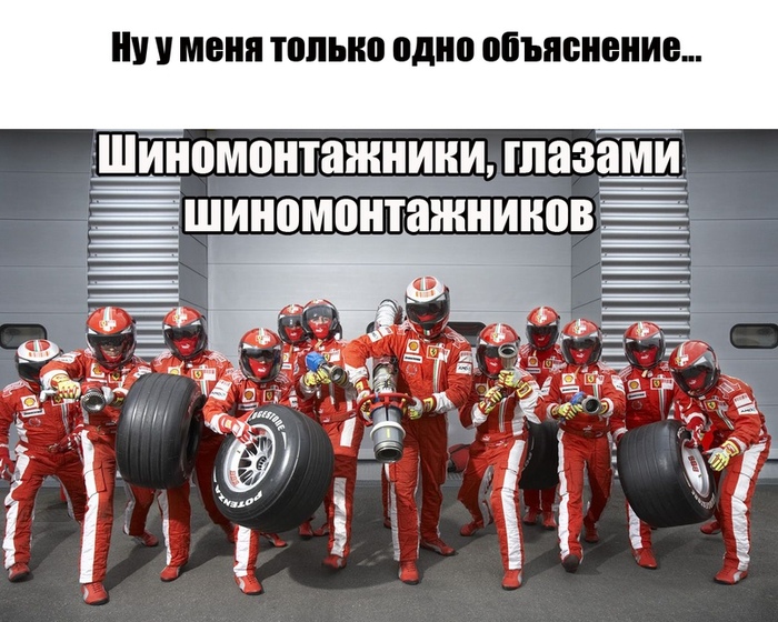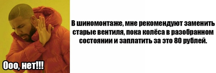 — Ребят, вы были правы, вентиля действительно спускают. Давай их поменяем. Что? Нужно опять разбирать колёса и платить за полную переобувку? А вы же вчера говорили 80 рублей! Аааа, тогда колёса уже были разобраны, ааа!