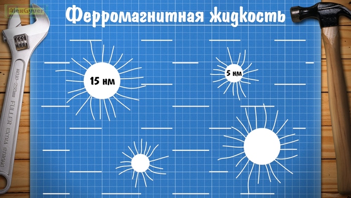 Ферромагнитная жидкость - это магнитные частицы (например магнетит – оксид железа), покрытые поверхностно-активным веществом (например олеиновая кислота) и помещённые в жидкость-носитель (например керосин). Частицы имеют размер от 5 до 15 нм, при таком размере они магнитятся, но не намагничиваются, то есть не взаимодействуют между собой и ведут себя как часть жидкости. Стабилизатор препятствует слипанию частиц между собой под воздействием внешнего магнитного поля.