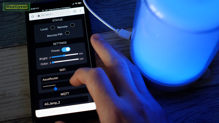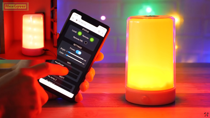 Лампа настраивается через веб-интерфейс и работает через бесплатный MQTT сервис, все подробности настройки - в видео выше.