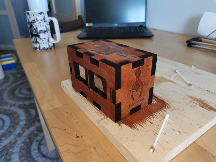 Чтобы подчеркнуть фактуру шпона фанеры (звучит, да?) я использовал морилку. Наносил в несколько слоев. Получилось на мой вкус очень насыщенно и приятно.