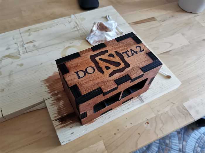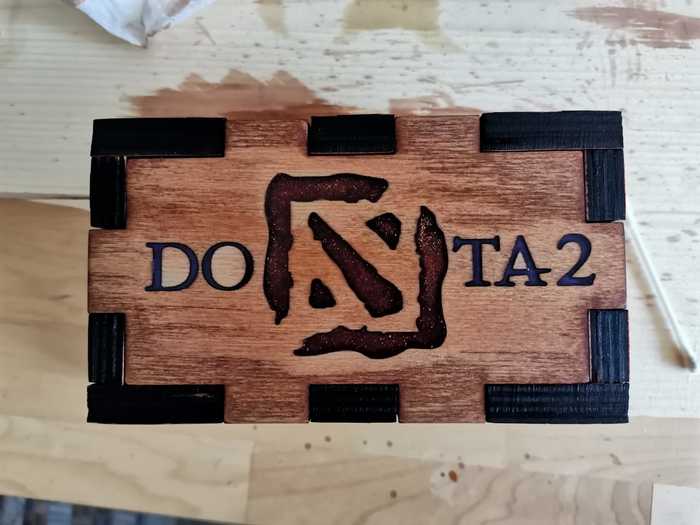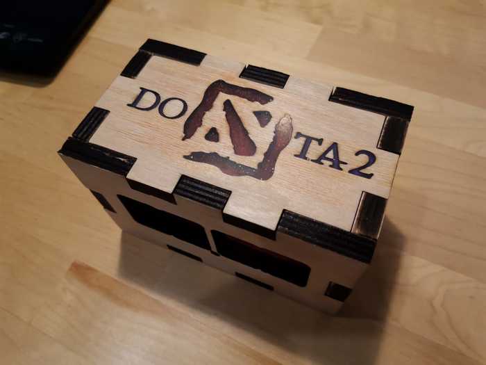Нашел вектор лого игры и дорисовал оригинальным шрифтом надпись "DOTA 2". Нашел векторы сигнатурочек товарища и все это добавил на необходимые плашки в dxf файле. С векторами персонажей пришлось помаяться - в качестве лого их нигде нет, только арты аутентичные. Но пара часов обведения в векторных пакетах для рисования и вуаля - все готово. На лазере выполнил резку и гравировку.