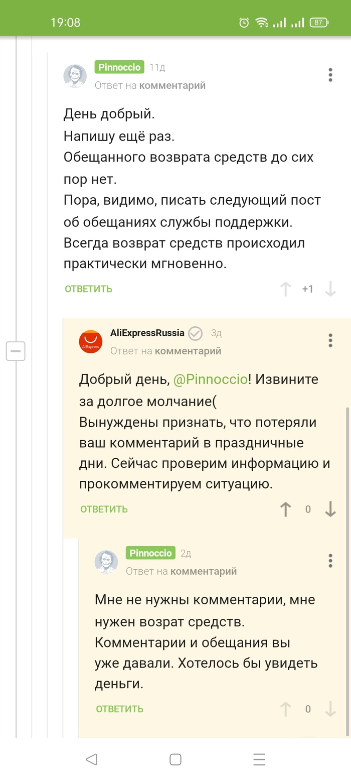 Как я уже писа́л ранее, воник вопрос по спору (диспуту) на али. Али предложил возврат, потом сам закрыл спор без возврата средств и объяснения причин. Написал сюда, объявился представитель от али, пообещал разобраться. Разобрался, пообещали возврат и исчезли. Через месяц обещаний, после моих напоминаний, отказались от своих слов.