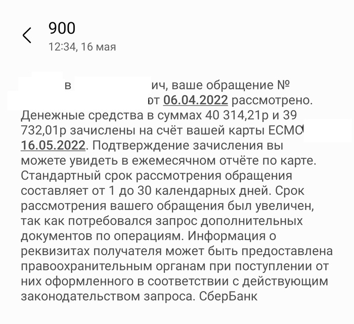 Мое заявление было зарегистрировано под № хх от хх.хх.хххх г., однако до настоящего времени денежные средства мне не возвращены, процедура chargeback не применена, а ПАО "Сбербанк России" уклонилось от предоставления какого- либо ответа на мое