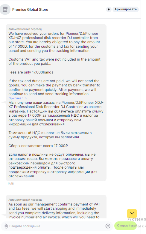 Мы получили ваши заказы на Pioneer/DJ/Pioneer XDJ-XZ Professional Disk Recorder DJ Controller из нашего магазина. Настоящим вы обязуетесь оплатить сумму в размере 17 000₽ за таможенный НДС и налог за отправку вашей посылки и отправку вам информации для отслеживания Таможенный НДС и налог не были включены в сумму продукта, которую вы заплатили... Сборы составляют всего 17 000₽ Если налог и пошлины не будут оплачены, мы не отправим товар. Вы можете произвести оплату банковским переводом для быстрого подтверждения оплаты. После оплаты мы продолжим отправку и отправку информации для отслеживания