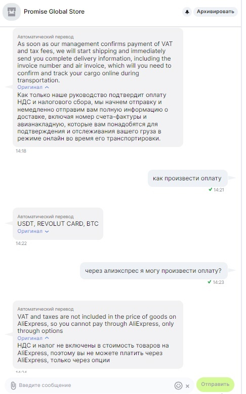 Псоел чего прислал в чат на али реквизиты карты для уплаты этого VAT