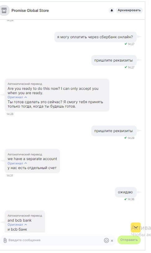 Далее продавец сообщает что оплату нельзя произвести на маркетплейсе.