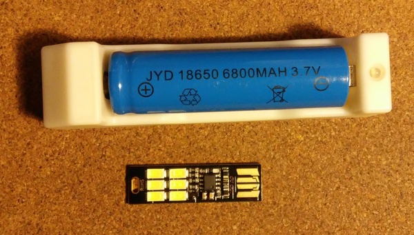 Рядом с фонариком для масштаба повербанк с аккумулятором 18650.