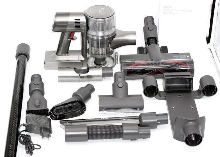 Мощность 550 Вт (190 аэроВатт), 150 тысяч оборотов в турбо-режиме. Комплект поставки пылесоса Dreame T30 включается в себя: основной модуль пылесоса со съёмной батареей, основную турбощетку, малую приводную щетку, трубку-удлинитель, три узких насадки (продольная щетка, поперечная щетка, щелевая насадка), гибкая насадка-удлинитель, насадка-колено, настенная база-органайзер с контактами и зарядное устройство.