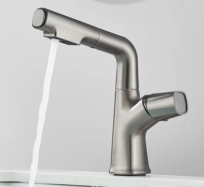 Смеситель Quyanre для кухонной раковины с выдвижным душем. Элегантный современный смеситель для кухонной раковины примечателен своей многофункциональностью. Верхняя часть оснащена выдвижным гибким шлангом, что повышает комфорт использования. В конструкции присутствует специальная кнопка для смены режимов подачи воды. В комплекте имеются все необходимые элементы для установки. Выбор доступен в четырёх вариантах цвета под любой вариант интерьера кухни.
