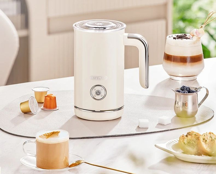Вспениватель для молока Cafelffe 4-в-1. Отличное решение для поклонников кофе, чайных миксов и горячего шоколада — простой в эксплуатации электроприбор, создающий молочную пену двух видов для приготовления тёплых и освежающих напитков, таких как капучино или латте, а также нагрева молока и варки горячего шоколада. Управление предельно простое одной кнопкой. Резервуар прибора сделан из пищевой нержавеющей стали AISI 304. Устройство быстро взбивает плотную пену и нагревает напиток до необходимой температуры (+65°C), работает тихо и элегантно вписывается в интерьер кухни.