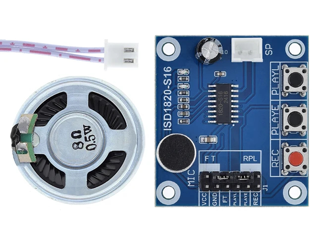 Электронный модуль записи и последующего воспроизведения записанного звука. Запись звука осуществляется от встроенного электретного, высокочувствительного микрофона. Используемый контроллер ISD1820 позволяет осуществлять 10 секундную запись звука в высоком качестве, энергонезависимое хранение записи, и последующее его воспроизведение записи на динамическую головку. Контроллер поддерживает непосредственное кнопочное управление. Стоит такой 119 руб. Ссылка на набор